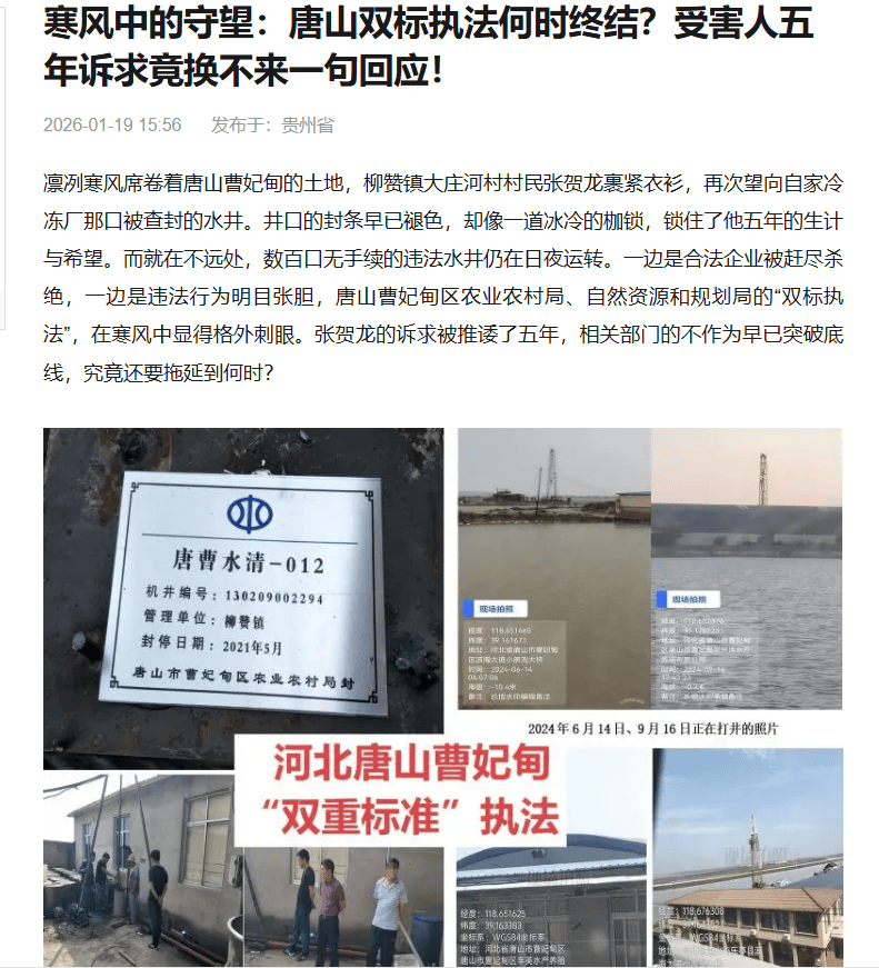 在河北唐山曹妃甸区,一场荒诞的执法闹剧正在上演。村民张贺龙合法承包的冷冻厂水井被粗暴查封,企业停滞五年维权无果;而禁采区内,数百口无手续水井却逆势涌现,违法打井行为明目张胆、愈演愈烈。这场鲜明对比的背后,直指曹妃甸区农业农村局与自然资源和规划局(下称 “两局”)的不作为、乱作为,其选择性执法的 “双重标准”,既是对法治尊严的公然践踏,也是对公共利益的恶意侵占。