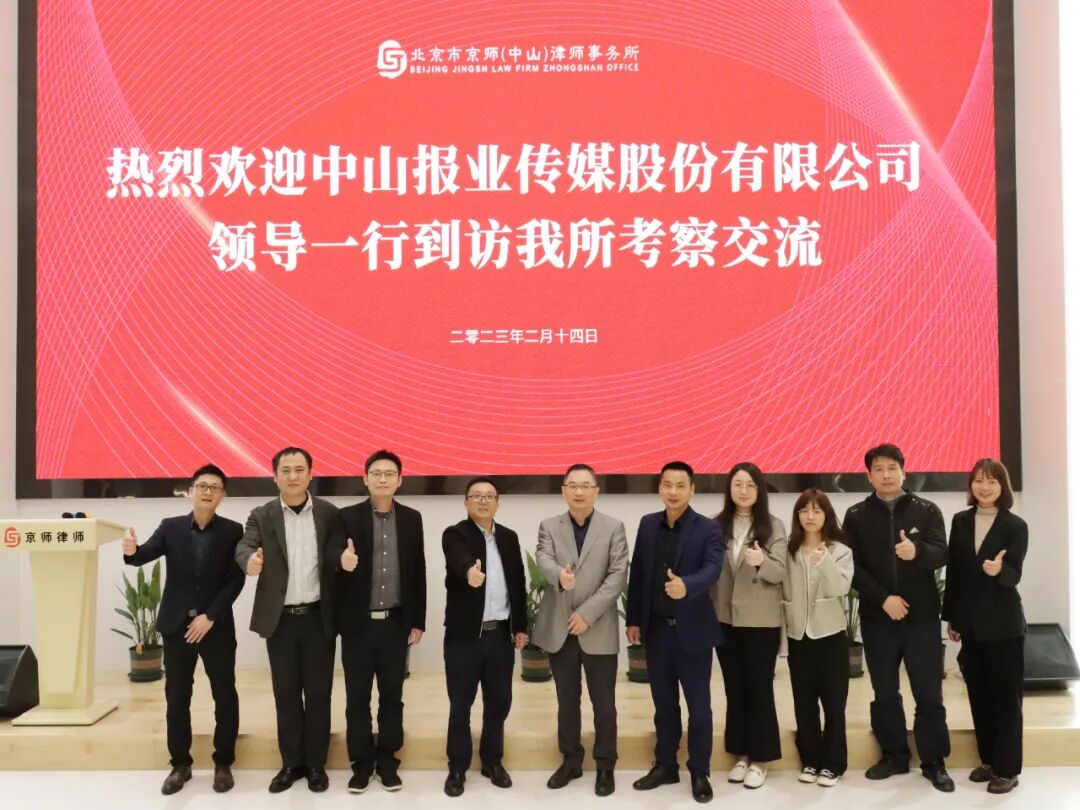 2023年2月14日下午,中山报业传媒股份有限公司董事、副总经理兼董秘邱永平,董办办公室主任黄锐钊,政务事业部总监赵学民一行到北京市京师(中山)律师事务所(以下简称“京师中山律所”)考察交流。